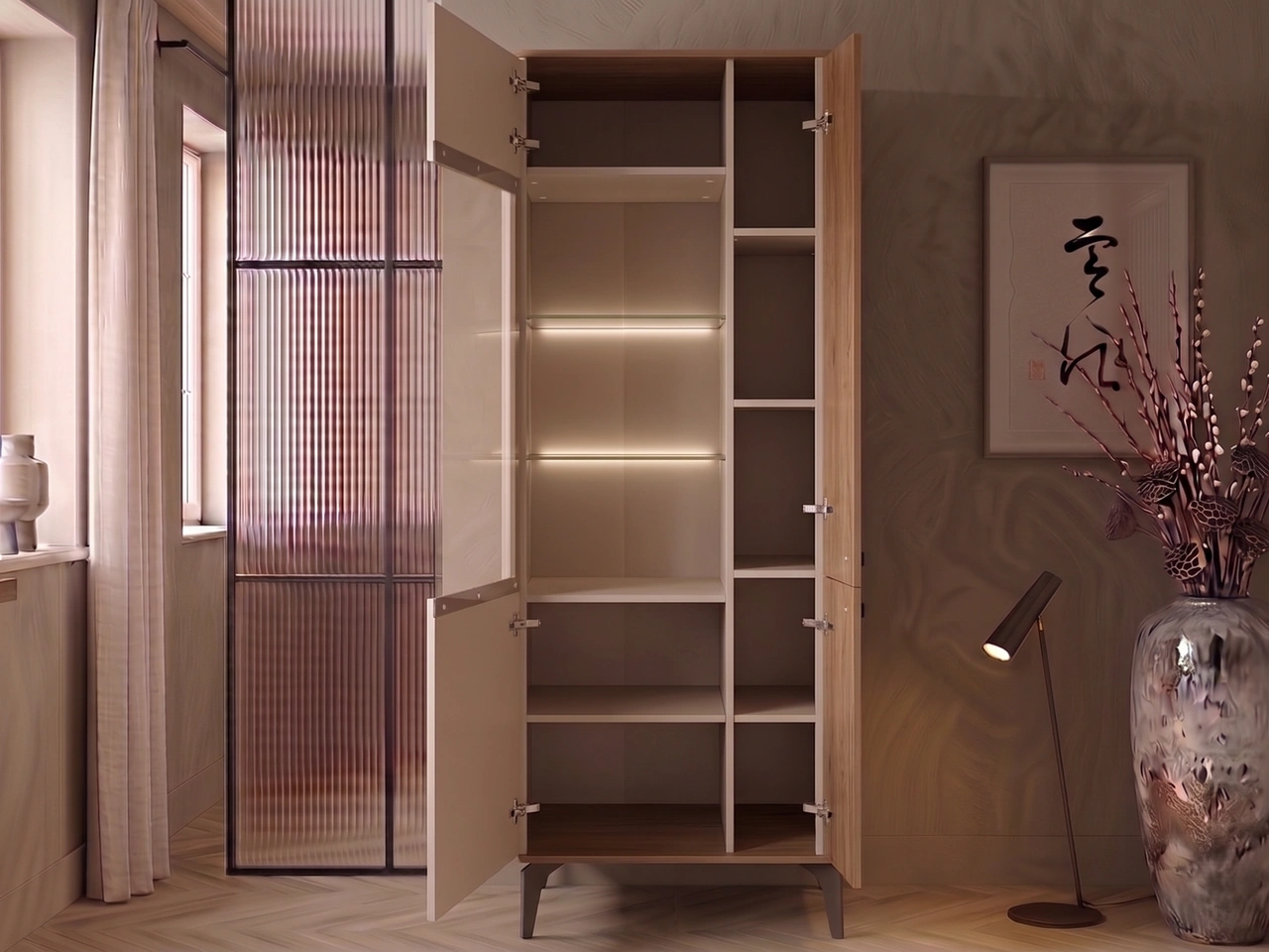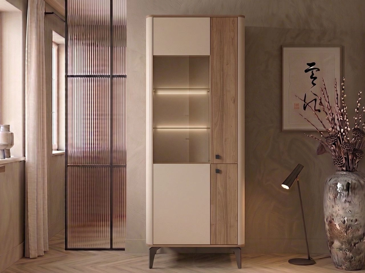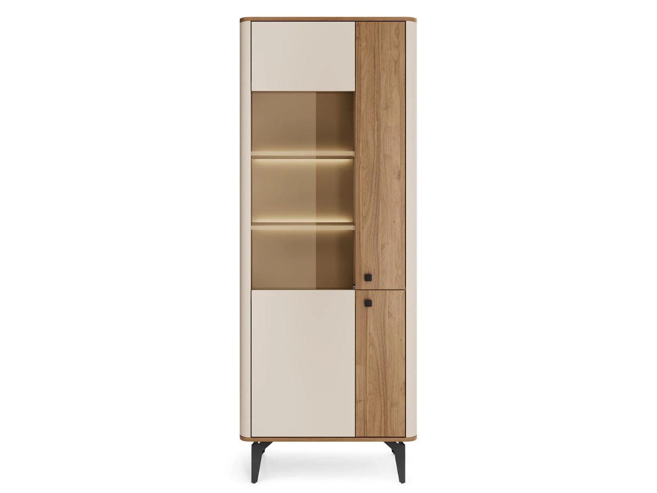 Uzupełnieniem kompozycji są komoda z trzema szufladami i dwiema parami drzwi w kolorystyce kaszmir i orzech Royal, oferująca praktyczną przestrzeń do przechowywania zastawy, tekstyliów czy dodatków do jadalni. Całość dopełnia wysoka witryna z oświetleniem LED, która pozwala efektownie wyeksponować dekoracje lub szkło, jednocześnie wprowadzając nastrojowe światło do wnętrza.