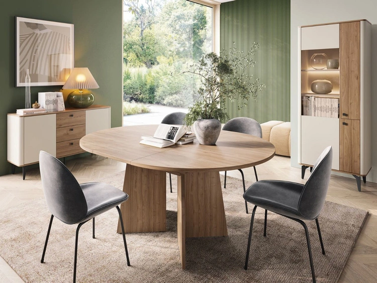 Centralnym elementem zestawu jest stół rozkładany w dekorze orzech Royal, który zapewnia wygodną przestrzeń użytkową na co dzień, a dzięki funkcji rozkładania doskonale sprawdza się podczas większych spotkań.