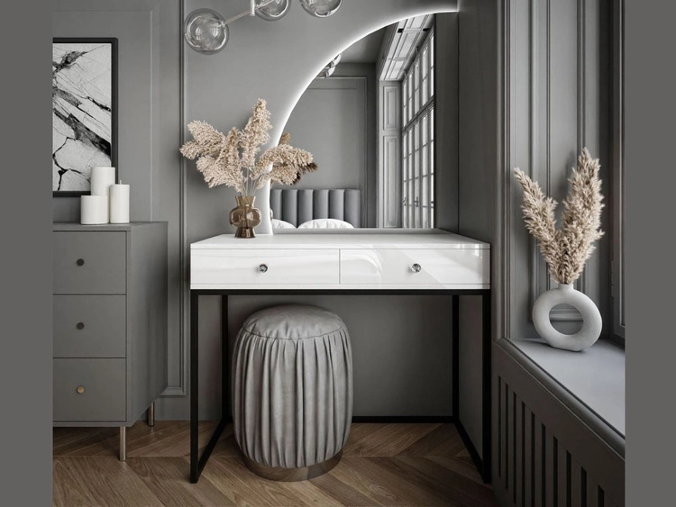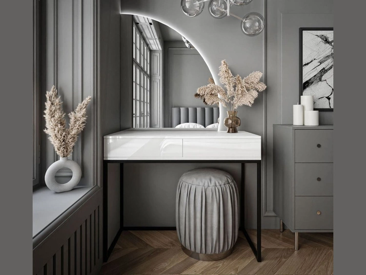Toaletka kosmetyczna prawostronna z szufladami i oświetleniem LED na czarnych nogach Clarette Biały połysk