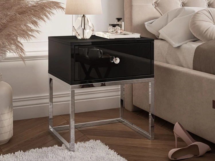 Stolik nocny glamour z szufladą i srebrnymi nogami Brisa czarny połysk
