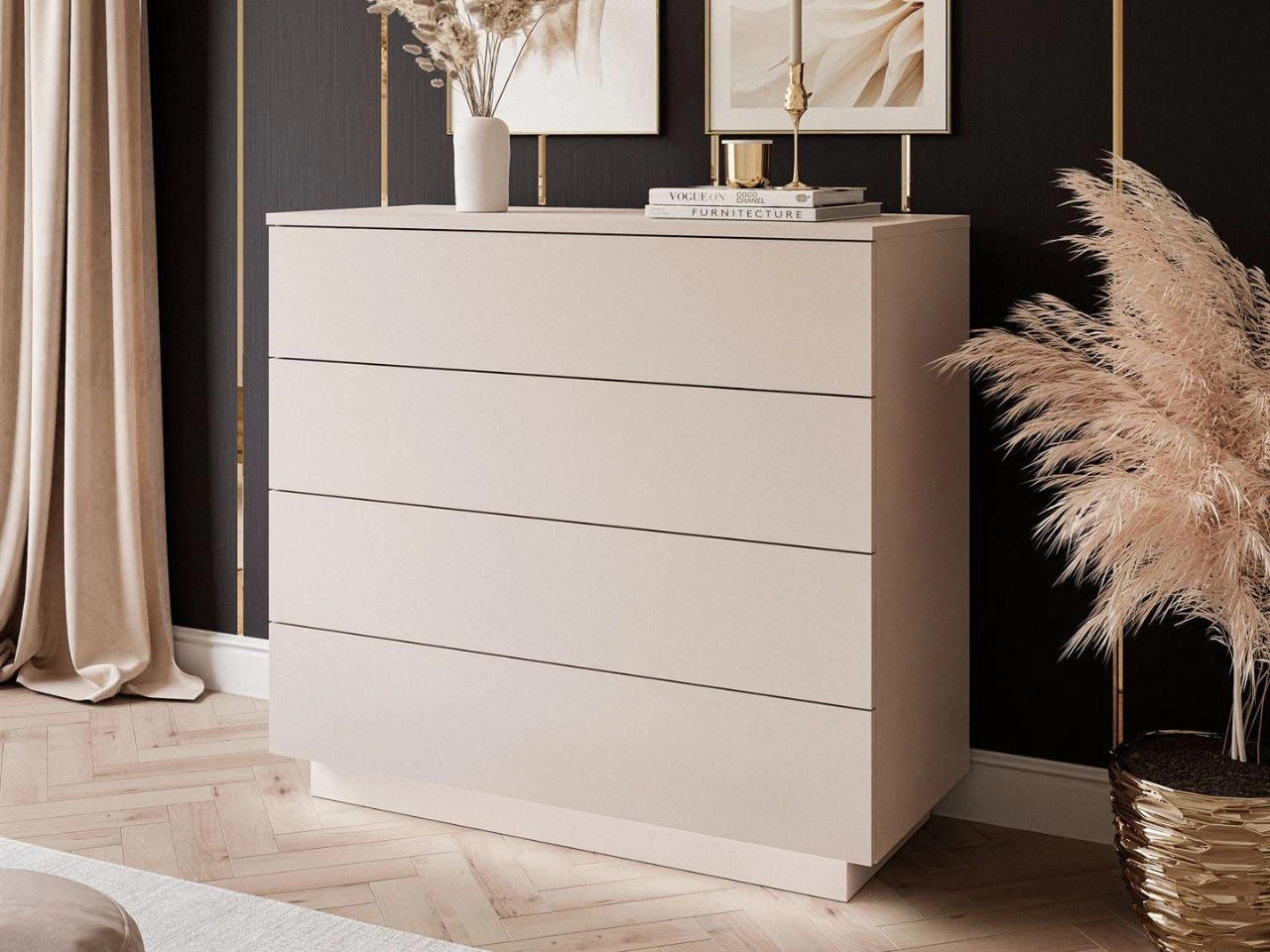 Czterodrzwiowa komoda 158 cm w stylu glamour ze złotymi uchwytami Lunelie kaszmir połysk