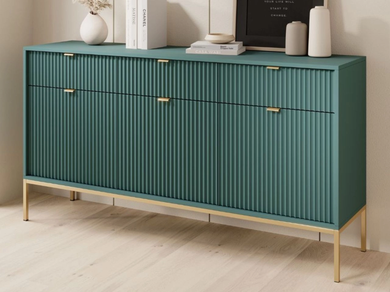 Komoda z drzwiami i szufladami Amber zielona na złotych nogach