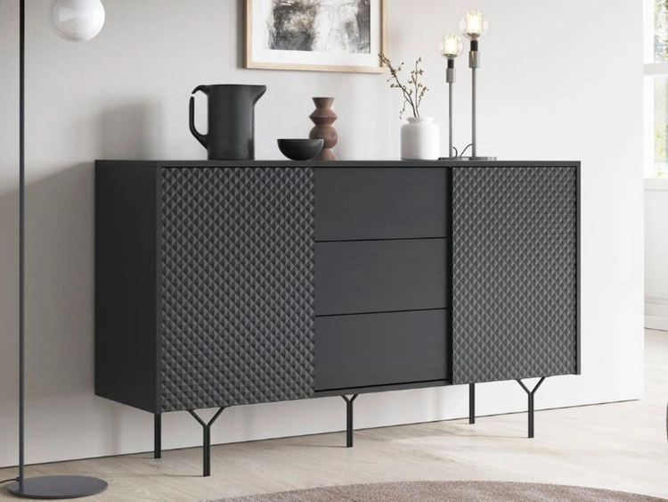 Trzydrzwiowa komoda 154 cm w stylu loft na czarnym stelażu Vivance czarny mat i dąb artisan