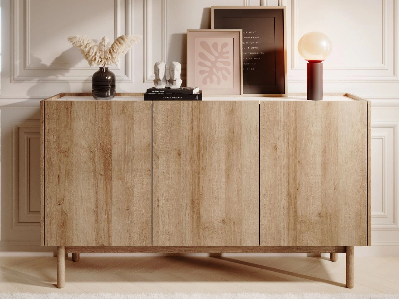 Trzydrzwiowa komoda 154 cm w stylu loft na białych nogach Vivance biały mat i dąb artisan