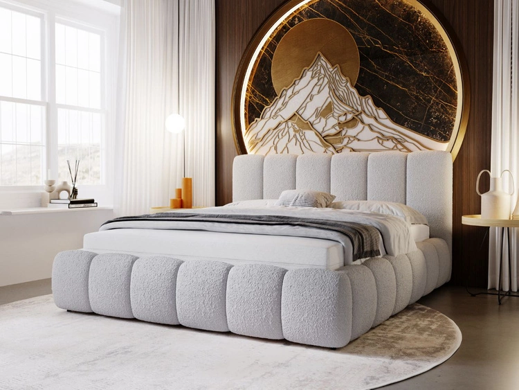Łóżko tapicerowane z pojemnikiem na pościel i stelażem 200x200 Modo w tkaninie bouclé Beżowe