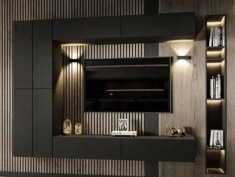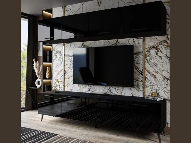 Meblościanka do salonu z oświetleniem LED na czarnych nogach Noaé Czarny połysk