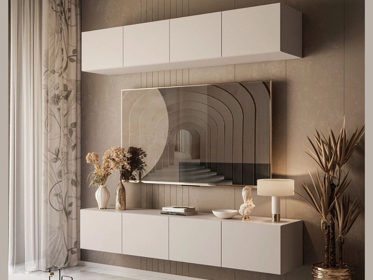 Meblościanka do salonu z oświeleniem LED na srebrnych nogach Noaé Biały połysk