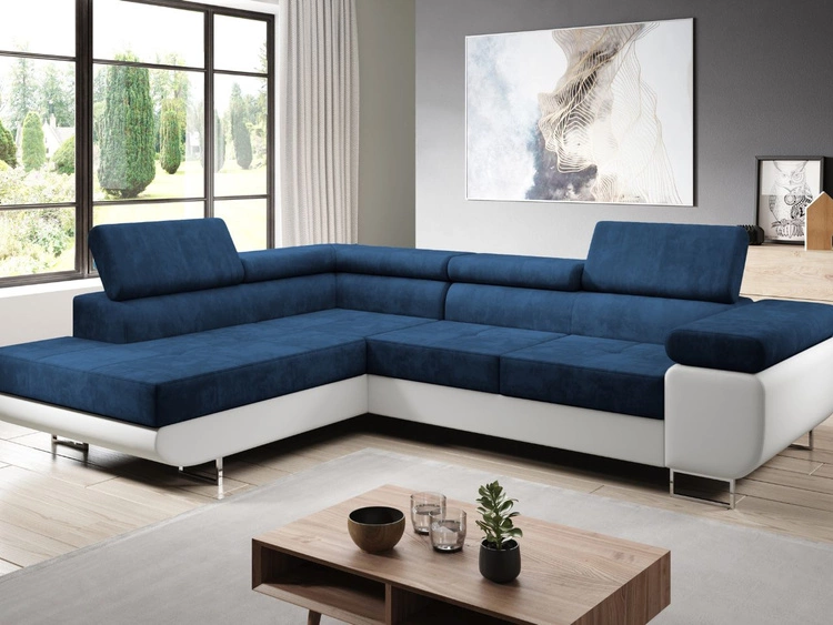 Narożnik lewy z funkcją spania i pojemnikiem Solam L Ciemny niebieski, Biały
