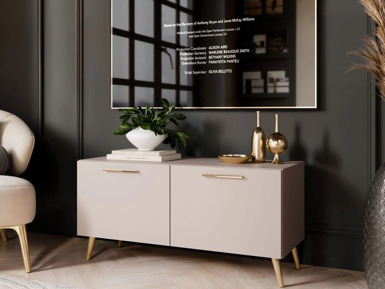 Szafka RTV 90 cm z oświetleniem LED i złotymi metalowymi nóżkami Aurelie Kaszmir mat