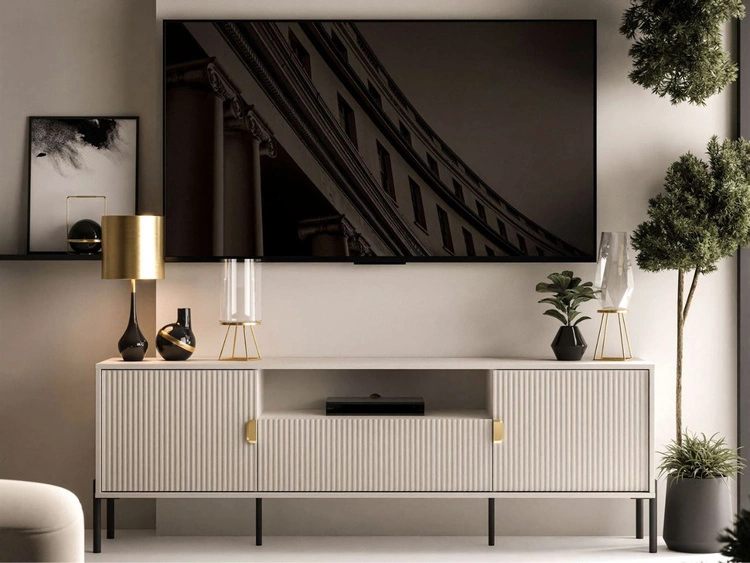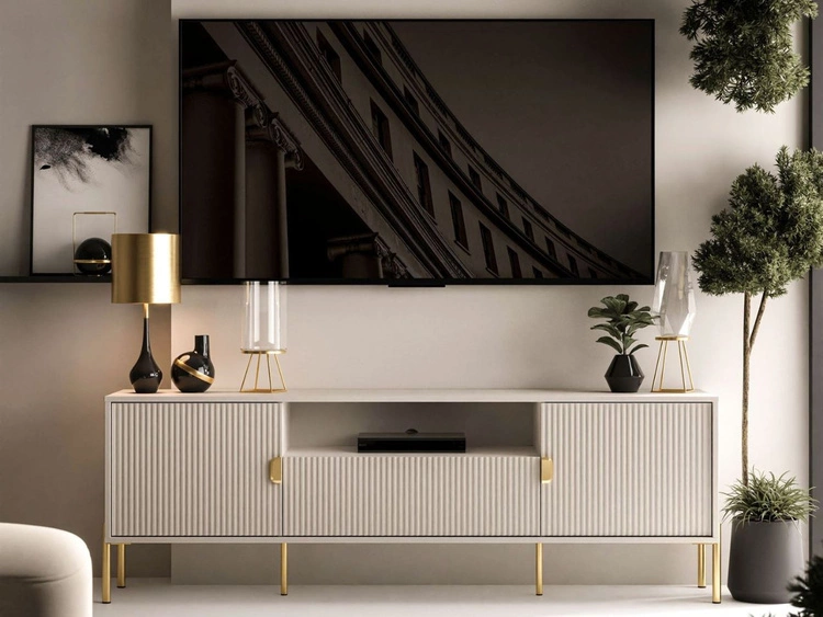 Szafka pod telewizor z drzwiczkami 175 cm z ryflowanym frontem Diolo Beżowa na złotych nogach