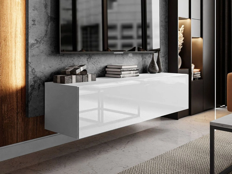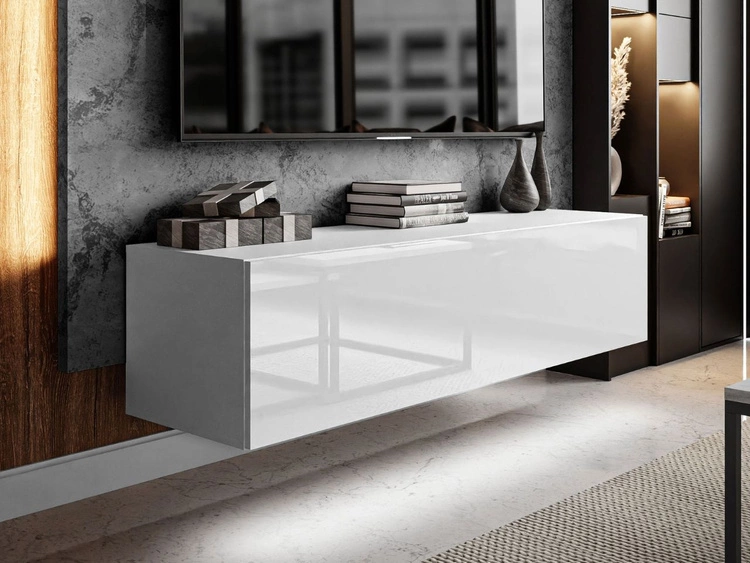 Ilość produktów: 105Wisząca szafka RTV pod telewizor z drzwiczkami i oświetleniem LED 150 cm Nodoo Biały połysk
