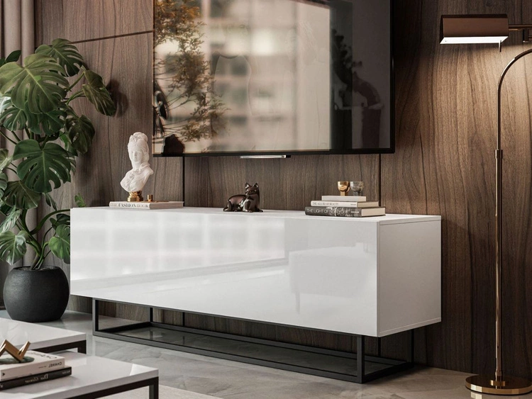 Szafka RTV pod telewizor z drzwiczkami na czarnym stelażu 150 cm Nodoo Biały połysk