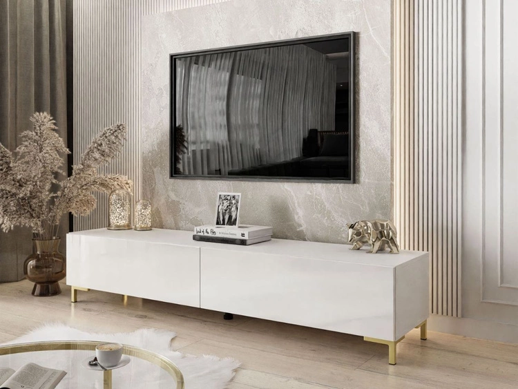Szafka RTV pod telewizor z drzwiczkami na złotych nóżkach 175 cm z oświetleniem LED Sorelle Biały połysk