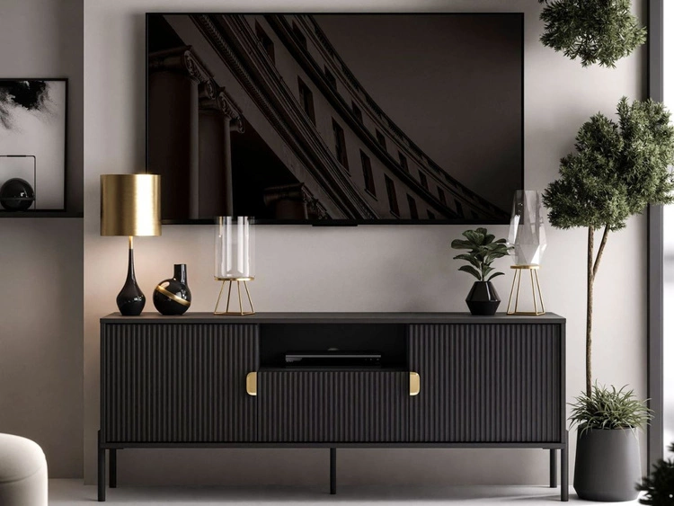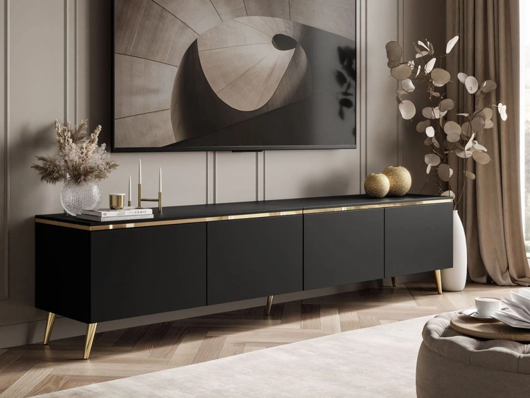 Szafka RTV pod telewizor z drzwiczkami na złotych nóżkach 175 cm Sorelle Czarny mat