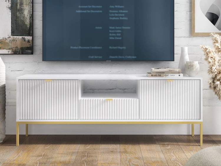 Szafka pod telewizor z drzwiczkami 135 cm z ryflowanym frontem Diolo Biała na złotych nogach