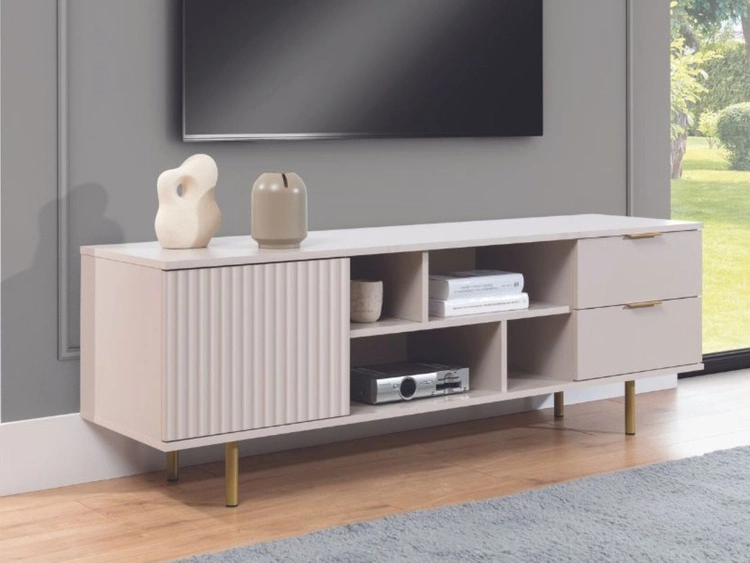 Szafka pod telewizor z drzwiczkami 135 cm z ryflowanym frontem Diolo Beżowa na złotych nogach