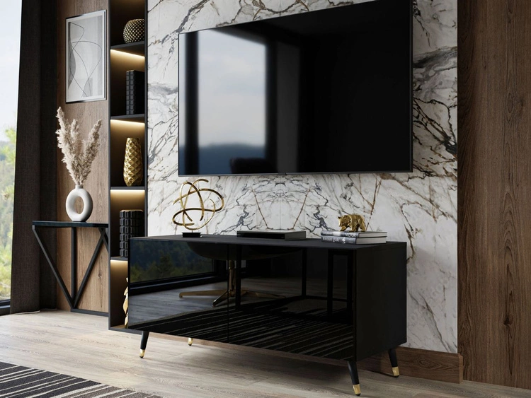 Szafka RTV pod telewizor z drzwiczkami na czarno-złotych nóżkach 100 cm Noaé Czarny połysk