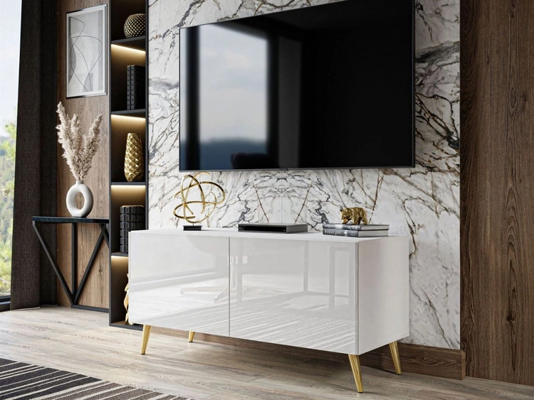 Szafka RTV pod telewizor z drzwiczkam i oświetleniem LED na złotych nóżkach 100 cm Noaé Biały połysk