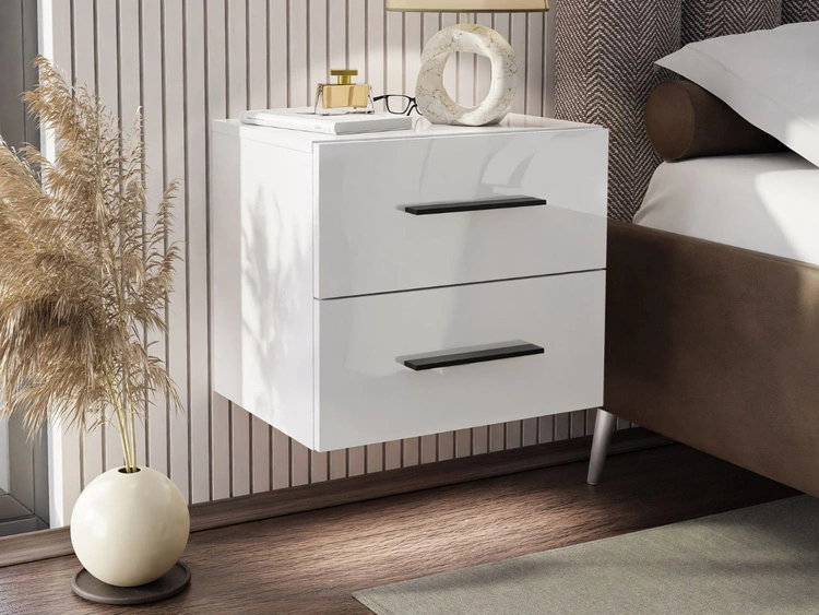 Stolik nocny z dwoma szufladami na czarnych nogach Nuveo Lux Biały Połysk