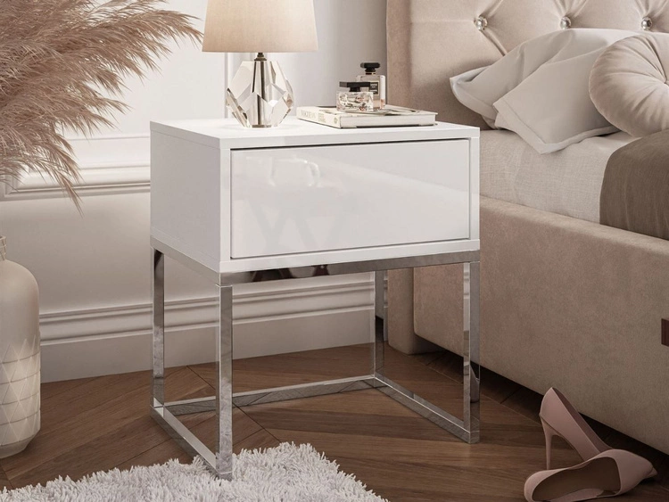 Stolik nocny glamour z szufladą i srebrnymi nogami Brisa biały połysk