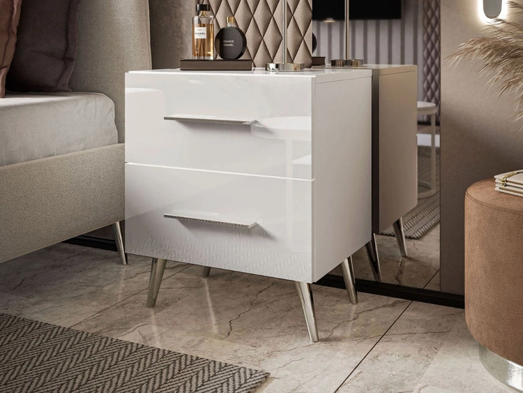Stolik nocny z szufladami na srebrnych nogach Nuveo Biały połysk