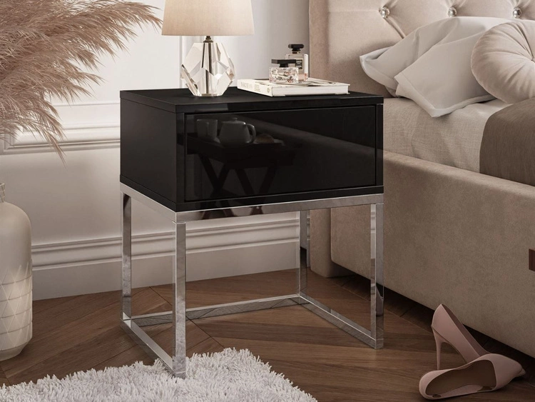 Stolik nocny z szufladą i srebrnymi nogami Brisa czarny połysk