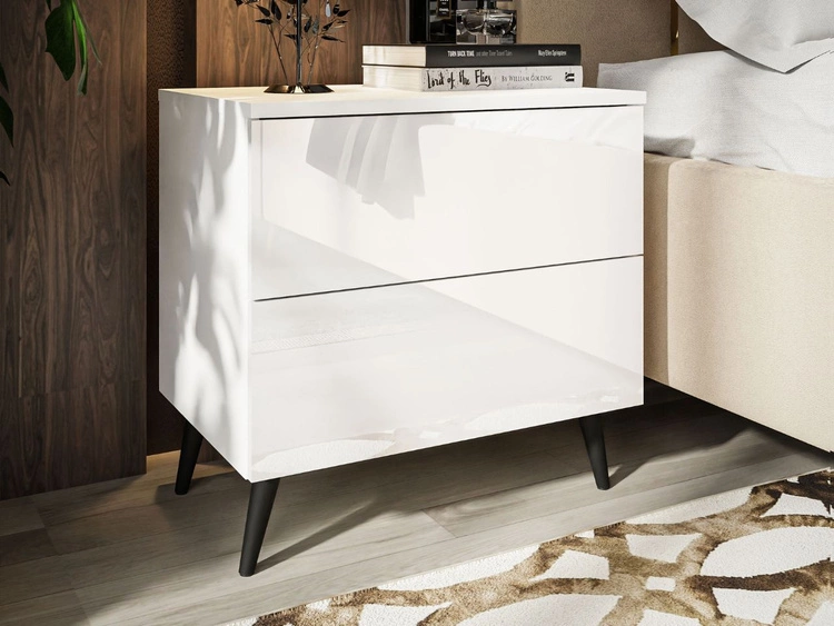 Stolik nocny z szufladami na czarnych nogach Nuveo Biały połysk