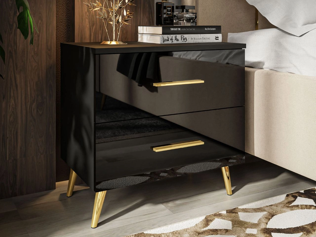 Ilość produktów: 103Stolik nocny z szufladami na złotych nogach Nuveo Czarny połysk