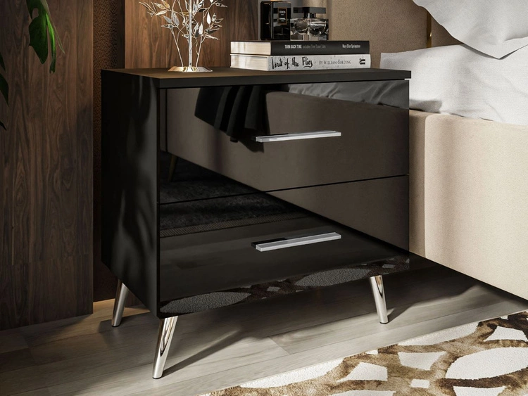 Stolik nocny glamour z szufladą i srebrnymi nogami Brisa czarny połysk