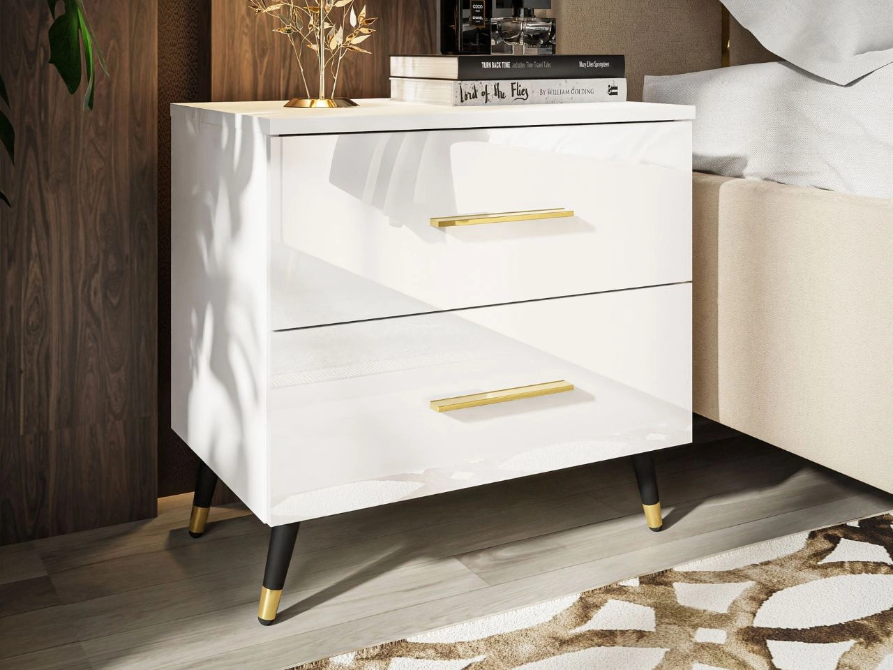 Stolik nocny z szufladami na czarno-złotych nogach Nuveo Biały połysk