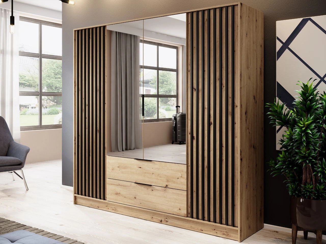 Szafa czterodrzwiowa z drzwiami uchylnymi 206 cm Macron Dąb Artisan z lustrem i lamelami