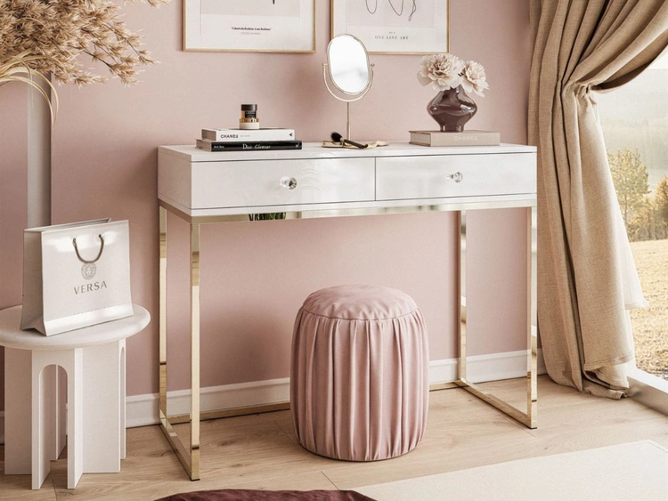 Konsola z szufladami, złotym stelażem i kryształowymi uchwytami Brisa biały połysk