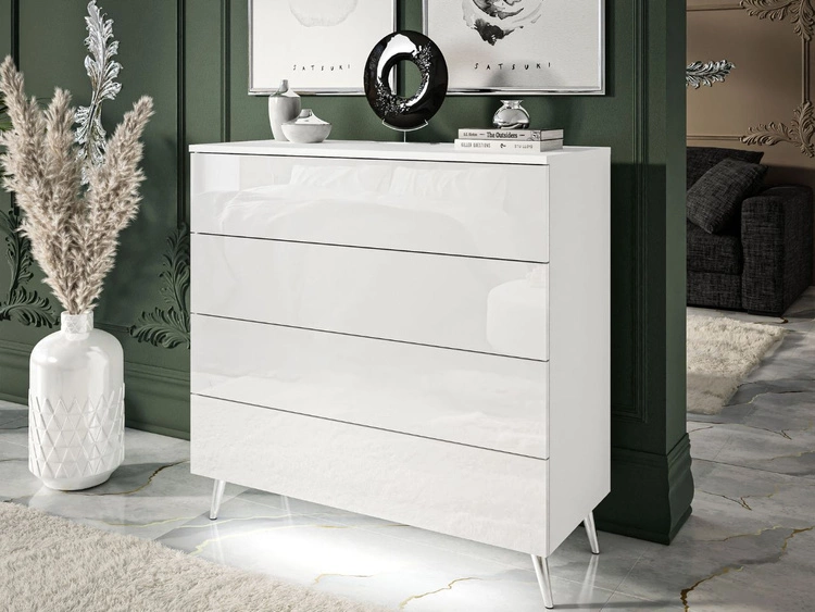 Ilość produktów: 844Komoda z czterema szufladami i oświetleniem LED na srebrnych nóżkach Nuveo Biały połysk