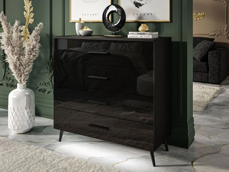 Komoda z czterema szufladami i oświetleniem LED na czarnych nóżkach Nuveo Czarny połysk
