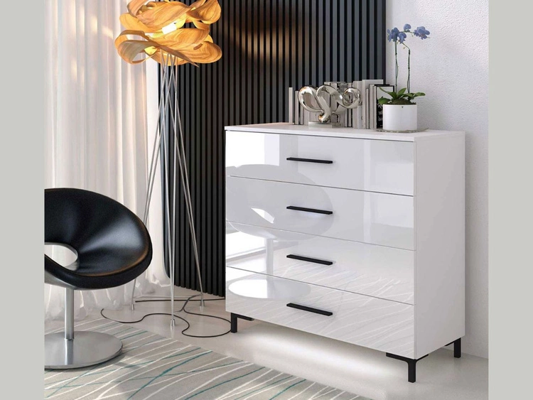 Komoda z czterema szufladami i oświetleniem LED na czarnych nóżkach Nuveo Biały połysk