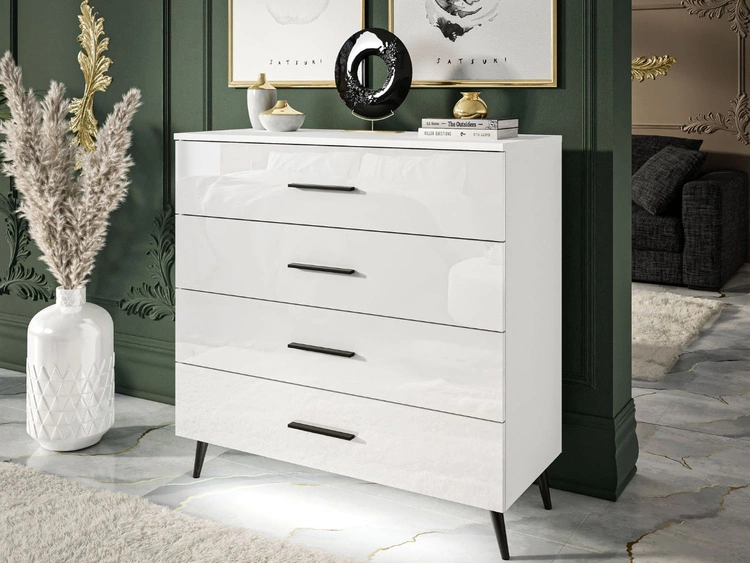 Komoda z czterema szufladami i oświetleniem LED na czarnych nóżkach Nuveo Biały połysk