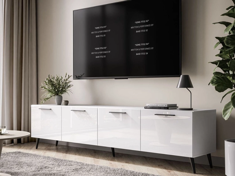 Szafka RTV pod telewizor z drzwiczkami na czarnych nóżkach 200 cm Noaé Biały Połysk