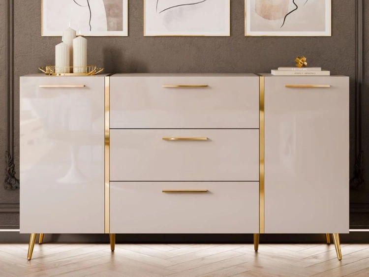 Dwudrzwiowa komoda 158 cm z trzema szufladami i złotymi uchwytami Lunelie kaszmir połysk