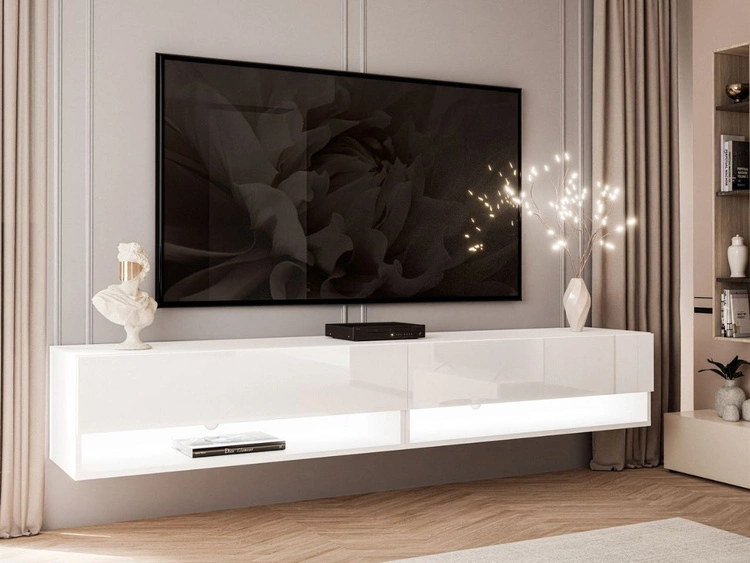 Szafka RTV wisząca 180 cm do salonu z oświetleniem LED Aurelie Biały połysk