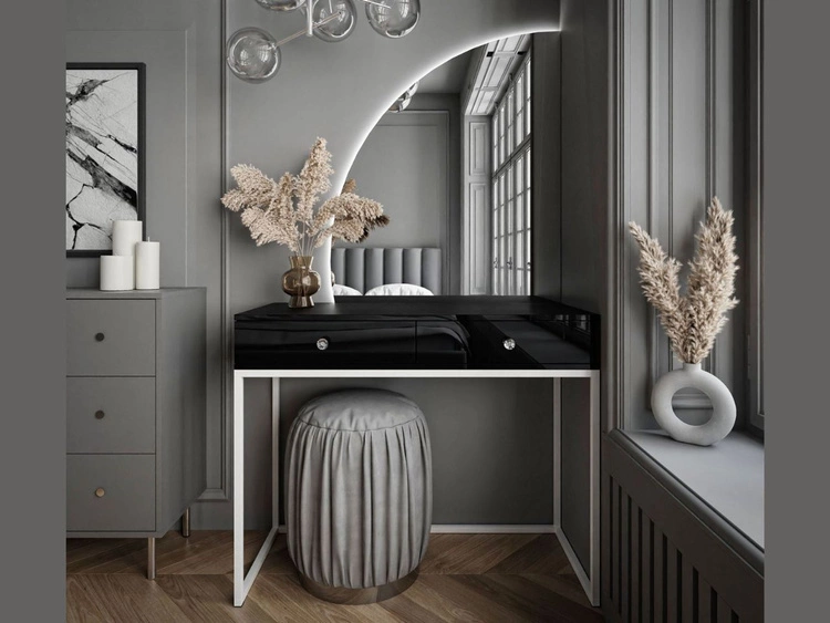 Toaletka kosmetyczna lewostronna z szufladami i oświetleniem LED na białych nogach Clarette Czarny połysk