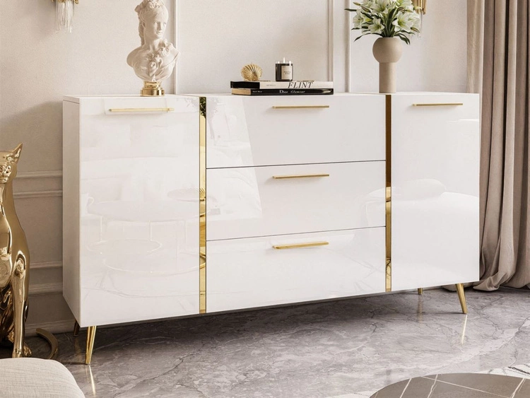 Dwudrzwiowa komoda 158 cm z trzema szufladami i złotymi uchwytami Lunelie biały połysk