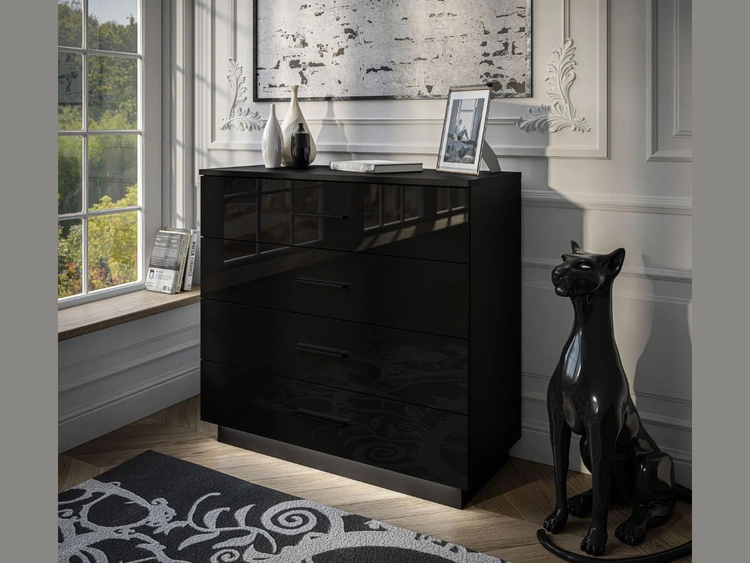 Komoda z czterema szufladami i oświetleniem LED na czarnych nóżkach Nuveo Czarny połysk