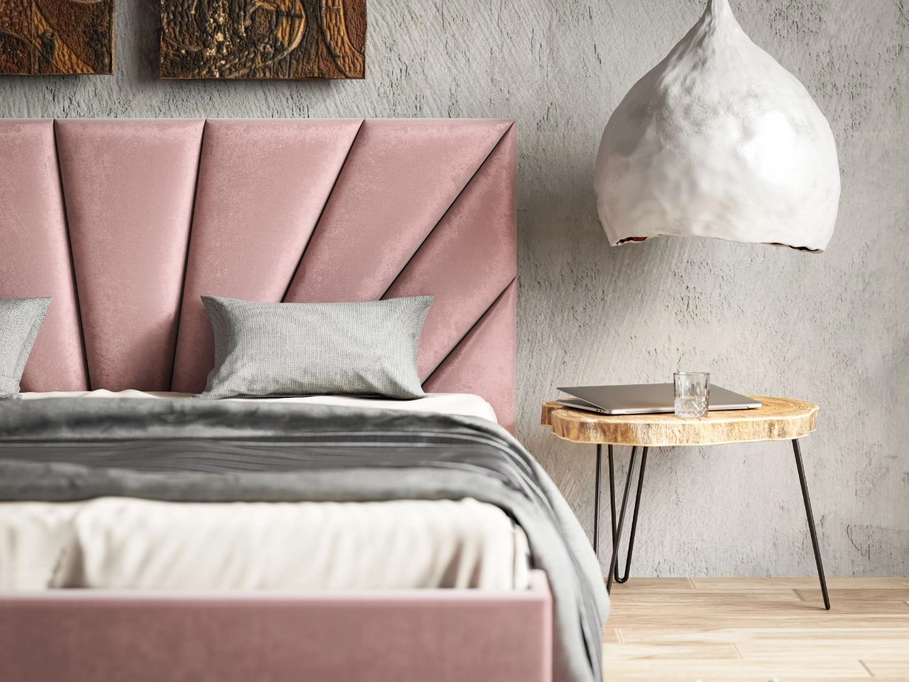 Łóżko tapicerowane Fuzi to elegancki i nowoczesny mebel, który doskonale łączy komfort z wyrafinowanym stylem. Jego cechą charakterystyczną jest wysokie wezgłowie ozdobione symetrycznymi, promieniście rozchodzącymi się przeszyciami, które nadają mu unikalnego wyglądu. Oprócz walorów estetycznych, wezgłowie zapewnia także wygodne podparcie dla pleców podczas odpoczynku, czytania czy oglądania telewizji.