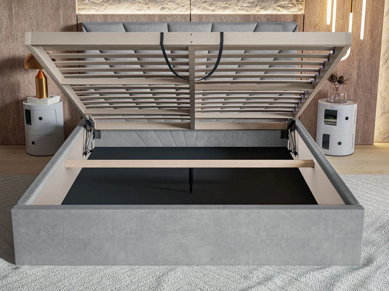 - Wzmocniona rama łóżka z automatami sprężynowymi wspomagającymi otwieranie