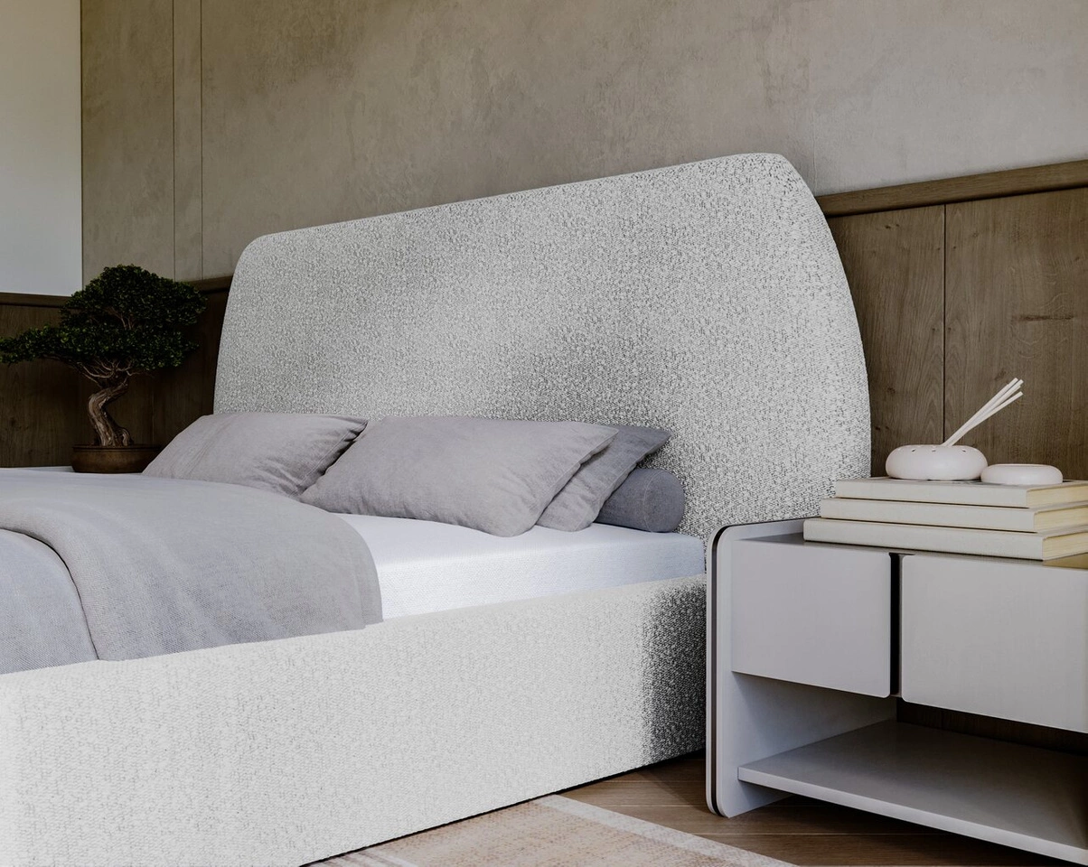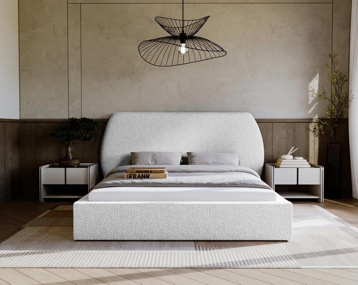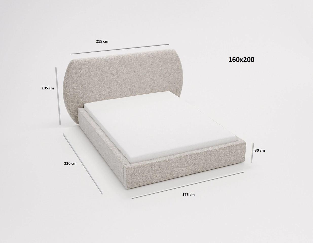 Łóżko zostało obite tkaniną Anthology, która należy do grupy materiałów typu bouclé (bukla). Jest to miękka, przyjemna w dotyku i delikatnie fakturowana tkanina, charakteryzująca się dekoracyjnym splotem drobnych pętelek i nieregularnych włókien. Dzięki temu materiał nie tylko prezentuje się niezwykle elegancko, ale również dodaje wnętrzu przytulności i ciepła. Tkanina Anthology jest wytrzymała, odporna na ścieranie i łatwa w czyszczeniu, co czyni ją doskonałym wyborem zarówno pod względem estetyki, jak i funkcjonalności.
