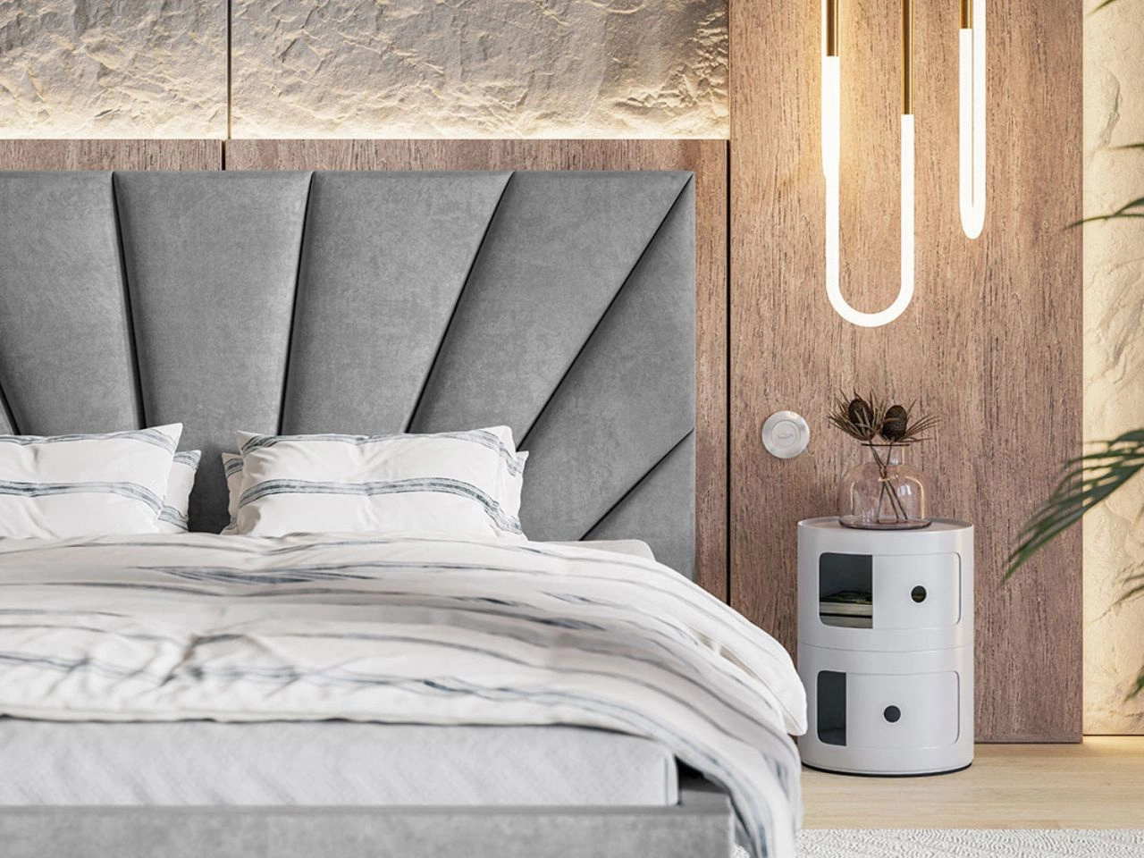Tapicerowane łóżko dwuosobowe Orlo to piękny mebel w nowoczesnym stylu. Jest idealnym wyborem dla wymagających klientów, którzy cenią sobie estetykę oraz doskonałe wykonanie. Dostępne jest w rozmiarach 120 × 200, 140 × 200, 160 × 200 oraz 180 × 200, dzięki czemu sprawdzi się zarówno w małych, jak i przestronnych sypialniach. Jego szczególną cechą jest zagłówek, który nie tylko pełni funkcję dekoracyjną, ale także stanowi wygodne podparcie dla kręgosłupa w pozycji siedzącej. Wezgłowie ozdobiono ciekawymi przeszyciami, które jeszcze bardziej podnoszą walory estetyczne łóżka Orlo.