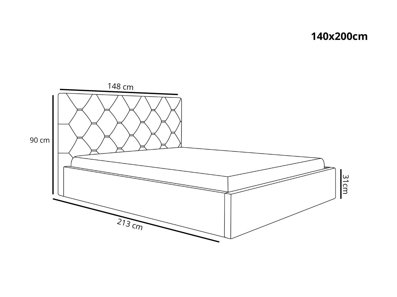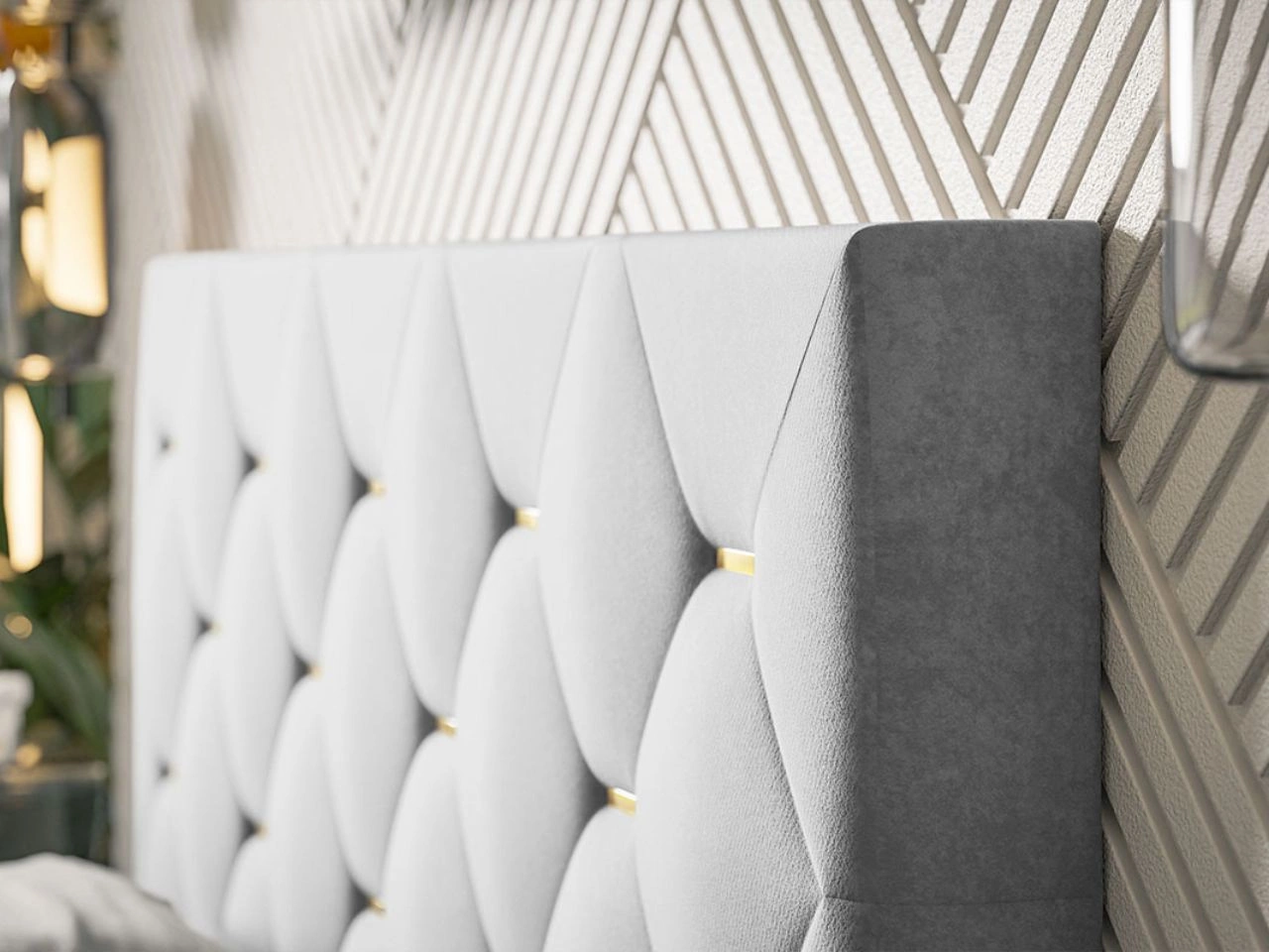 Tapicerowane łóżko Salento to niezwykle stylowy model, w którym główną rolę odgrywa wysokie wezgłowie. Jego powierzchnia ozdobiona jest geometrycznymi przeszyciami, a na ich przecięciach znajdują się eleganckie złote guziki. Z pewnością przypadnie do gustu zarówno miłośnikom stylu glamour, jak i zwolennikom nowoczesnych aranżacji. Łóżko wyposażone jest także w pojemny pojemnik na pościel, który otwiera się poprzez uniesienie ku górze drewnianego stelaża pod materac (materac nie znajduje się w zestawie). Otwieranie ułatwiają wbudowane automaty sprężynowe, dzięki czemu cały proces jest praktycznie bezwysiłkowy. To doskonały wybór dla wymagających klientów, którzy cenią piękno i doskonałe wykonanie. Dostępne w rozmiarach 120 × 200, 140 × 200, 160 × 200, 180 × 200 cm, dzięki czemu sprawdzi się zarówno w małych, jak i przestronnych sypialniach.