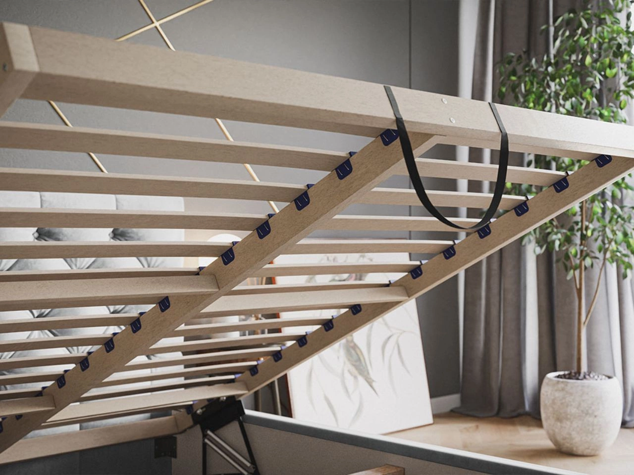 • Zawiera drewniany stelaż pod materac