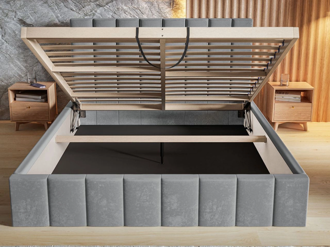 Dwuosobowe łóżko tapicerowane Siena zostało wyposażone w przestronny pojemnik na pościel, który ukryto we wnętrzu masywnej skrzyni. Tę ostatnią zbudowano w oparciu o ramę z solidnego drewna, połączoną z wysokiej klasy płytą meblową. Całość posiada odpowiednią sztywność i wytrzymałość, która pozwoli na wieloletnie, bezproblemowe użytkowanie. Łóżko posiada również drewniany stelaż pod materac w zestawie. Po uniesieniu stelaża ku górze, otrzymamy dostęp do pojemnika na pościel. Cały proces prawie nie wymaga wysiłku, dzięki zastosowaniu automatów sprężynowych wspomagających otwieranie.