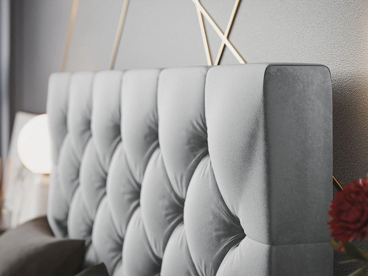 Dwuosobowe łóżko tapicerowane Selva swym designem przywodzi na myśl stylistykę glamour, ale sprawdzi się również doskonale w nowoczesnych aranżacjach. Wiodącym elementem jest tutaj wysokie wezgłowie, które zostało obite miękką pianką i wykończone głębokim pikowaniem guzikowym. Zagłówek prezentuje się przez to naprawdę elegancko, a przy tym stanowi praktyczną podporę dla naszych pleców, kiedy na przykład czytamy w łóżku.